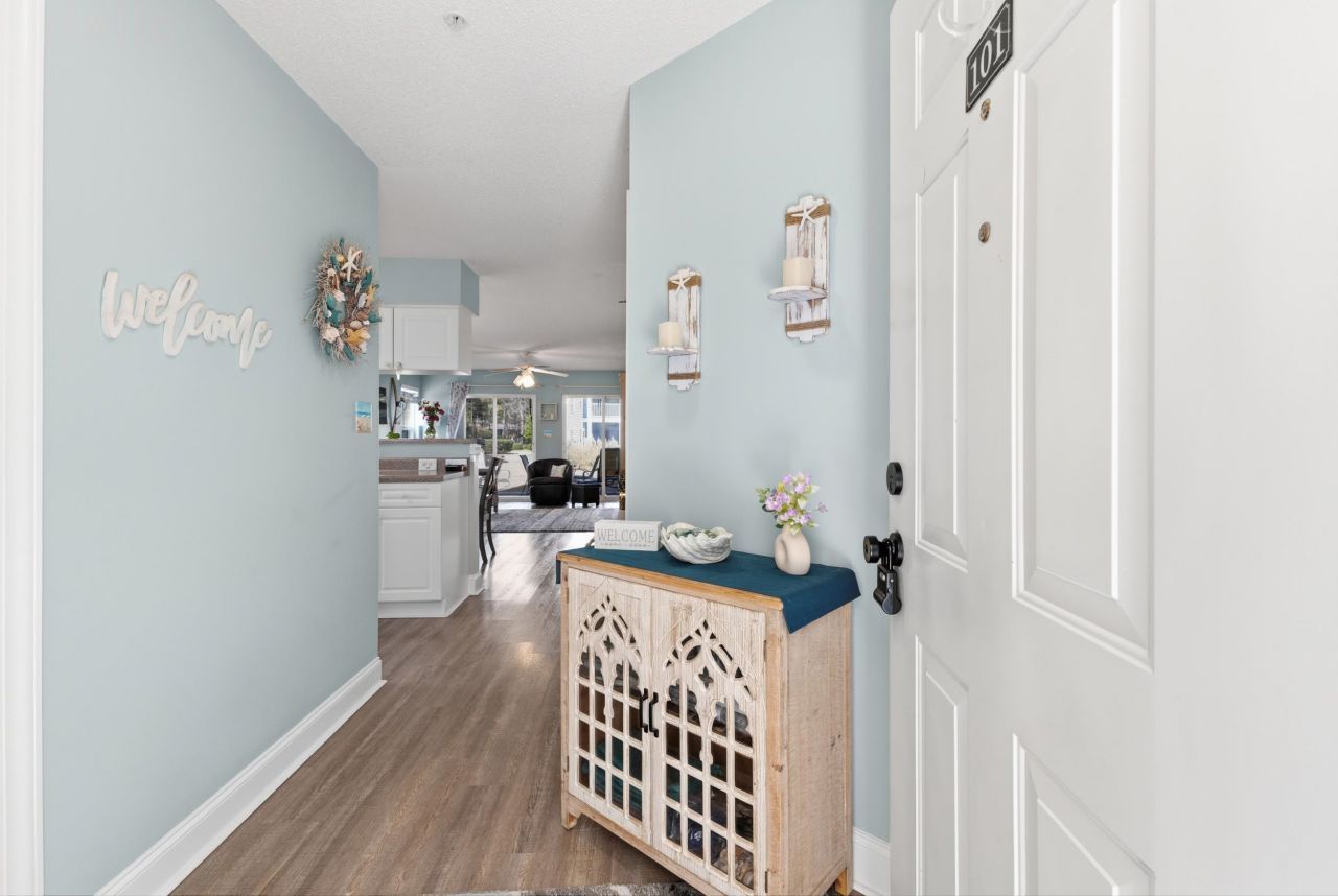 Welcome to this beautifully maintained end-unit, 2-bedroom, 2-bathroom first-floor condo in the heart of Murrells Inlet, located just 1.3 miles from the beach. Situated within a secluded, established neighborhood with mature landscaping, this property offers privacy, convenience, and low-maintenance coastal living. Designed for effortless single-level living, the open-concept layout creates a seamless flow between the kitchen, dining, and living areas. Durable LVP flooring runs throughout the entry, kitchen, bathrooms, and living room, providing a clean, modern look and easy upkeep. The kitchen features stainless steel appliances, ample cabinetry, and a layout ideal for both everyday living and entertaining. Both bedrooms offer new carpet for added comfort and warmth. The primary suite provides generous closet space and private access to the screened-in rear patio a standout feature of this home. Step outside and enjoy beautiful water views in a peaceful setting, perfect for morning coffee, evening relaxation, or hosting guests. The secondary bathroom includes a walk-in shower, offering convenience and functionality for visitors or everyday use. The screened-in patio extends your living space outdoors while allowing you to enjoy coastal breezes year-round. Whether youre looking for a primary residence, a second home near the beach, or an investment opportunity, this floor plan offers flexibility and strong appeal. Residents enjoy community pool access and a quiet atmosphere just minutes from beaches, golf courses, marinas, shopping, dining, and the Murrells Inlet MarshWalk. With first-floor convenience, water views, and proximity to the coast, this property delivers an exceptional lifestyle opportunity in one of the most desirable areas along the South Carolina shoreline. All measurements and square footage are approximate and not guaranteed. Buyer responsible for verification. Designed for easy single-level living, the open-concept layout provides a seamless flow between the kitchen, dining, and living areas. Durable LVP flooring runs throughout the entry, kitchen, bathrooms, and living room, delivering both style and functionality. The kitchen features stainless steel appliances, ample cabinetry, and a pantry closet for additional storage. A convenient coat closet near the entry adds everyday practicality. Both bedrooms offer new carpet for comfort. The spacious primary suite includes a walk-in closet and private access to the screened-in rear patio, creating a peaceful retreat with beautiful water views. The secondary bathroom features a walk-in shower, ideal for guests or daily convenience. The screened-in patio extends your living space outdoors and overlooks a serene water setting perfect for morning coffee or relaxing evenings. As an end unit, this condo benefits from additional privacy and natural light. Additional features include a dedicated laundry room with a storage closet, providing extra organization and functio